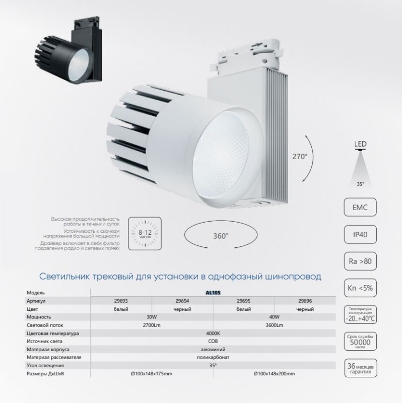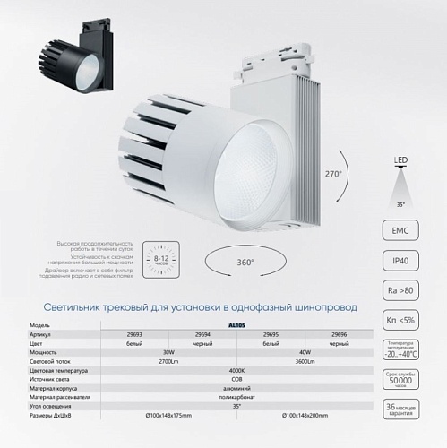 Характеристики Светодиодный светильник Feron AL105 трековый однофазный на шинопровод 40W 4000K, 35 градусов, белый серия MarketBright