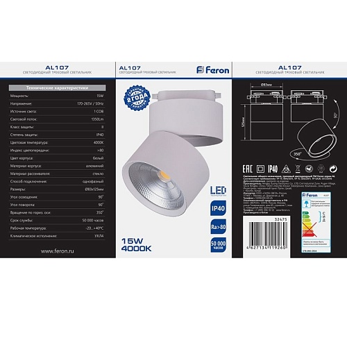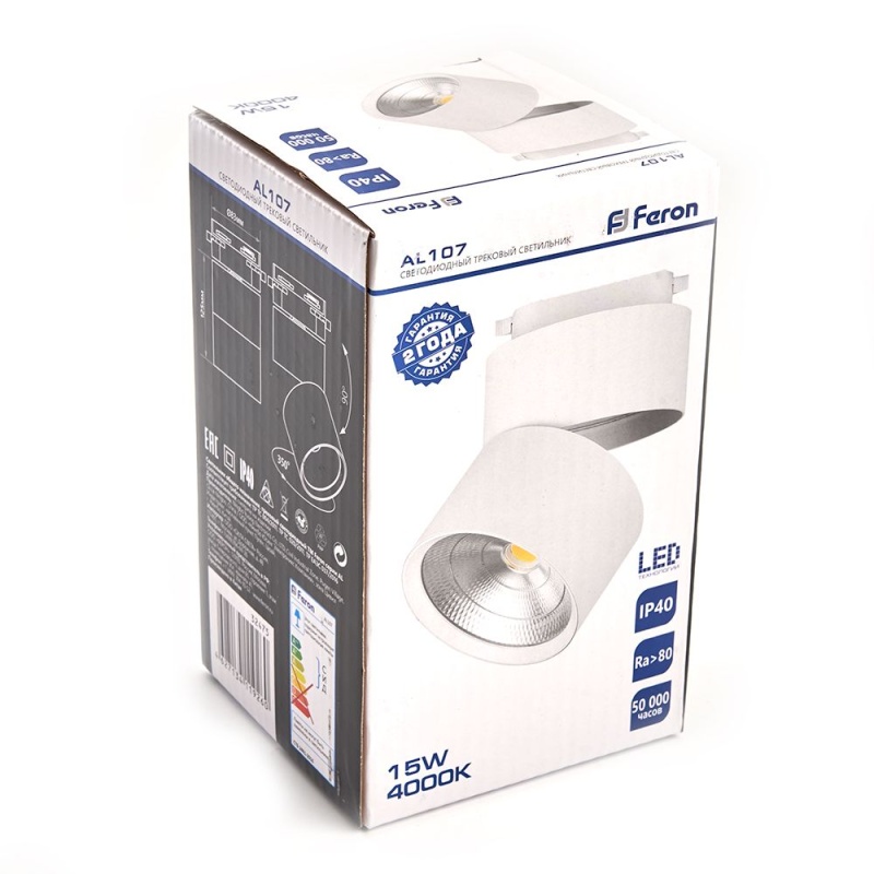 Характеристики Светодиодный светильник Feron AL107 трековый однофазный на шинопровод 15W, 90 градусов, 4000К, белый