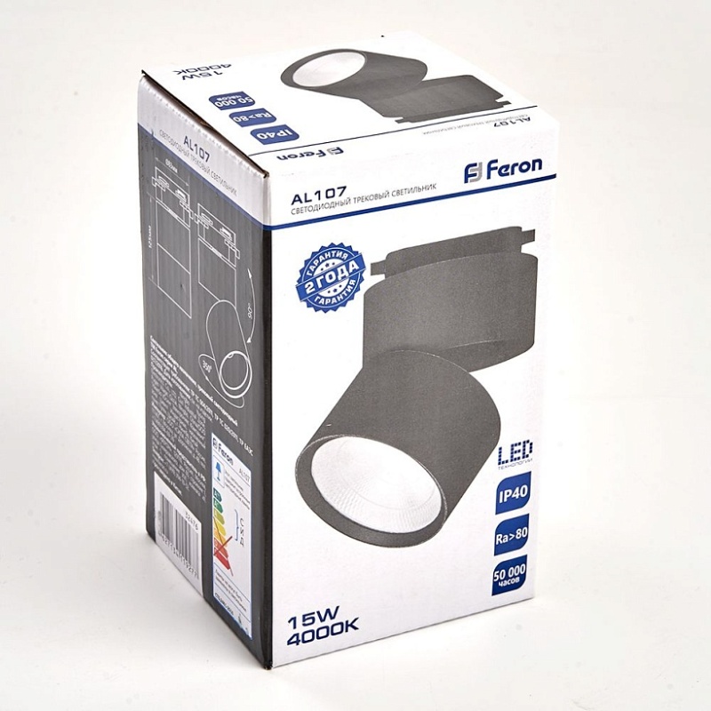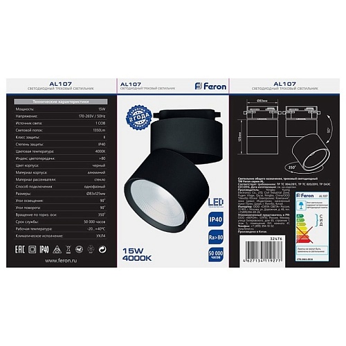 Характеристики Светодиодный светильник Feron AL107 трековый однофазный на шинопровод 25W, 90 градусов, 4000К, белый