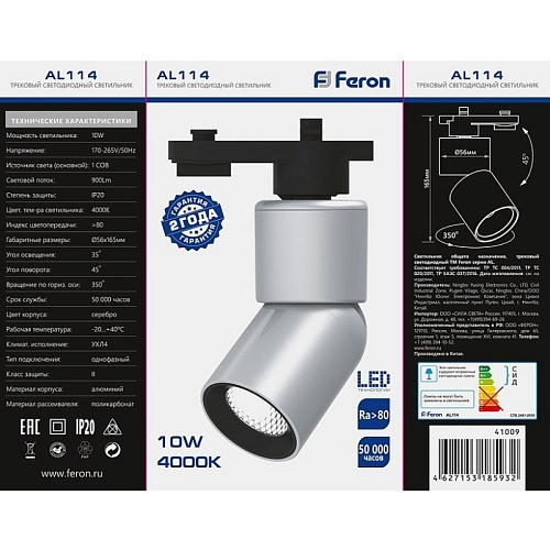 Характеристики Светильник трековый на шинопровод FERON AL114 41009