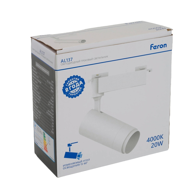 Характеристики Светодиодный светильник Feron AL137 трековый однофазный на шинопровод 20W 4000K белый, изменяемый угол освещения 15-60град
