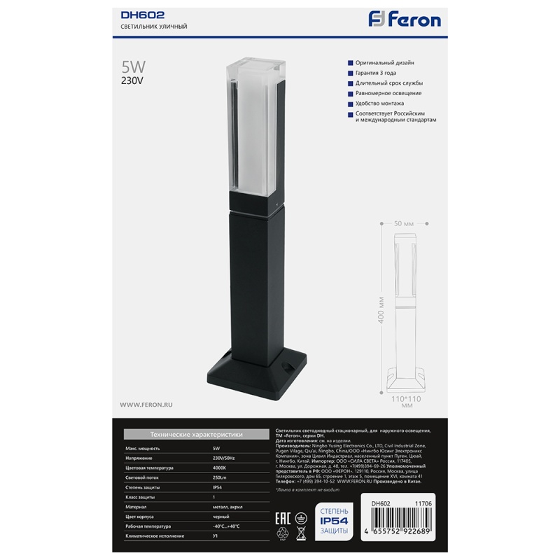 Характеристики Светильник уличный светодиодный Feron DH602, 5W, 250Lm, 4000K, черный