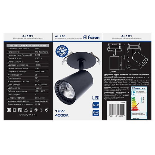 Характеристики Светодиодный светильник Feron AL181 встраиваемый 20W 4000K белый