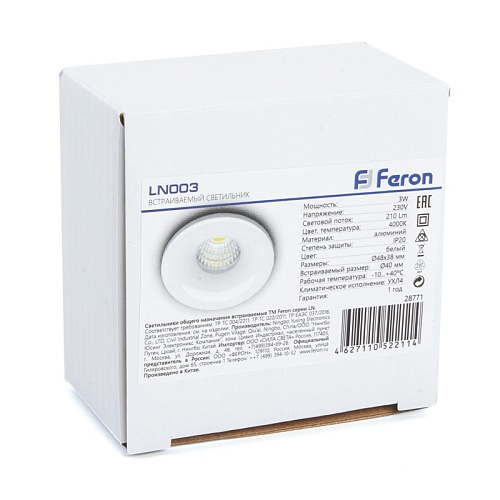 Характеристики Светодиодный светильник Feron LN003 встраиваемый 3W 4000K белый