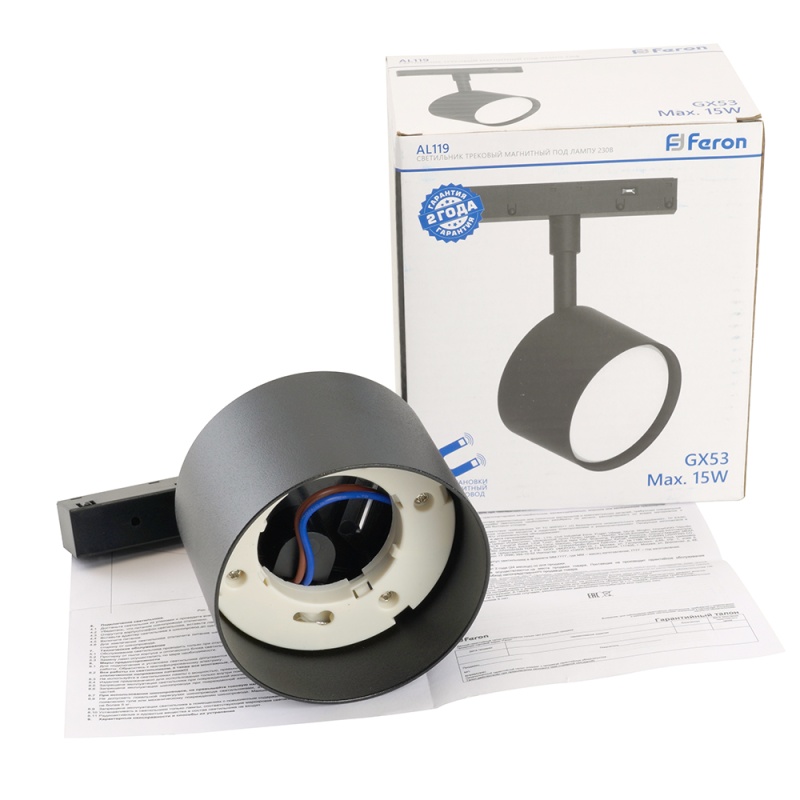 Характеристики Светильник Feron AL119 трековый магнитный под лампу GX53 230В, черный