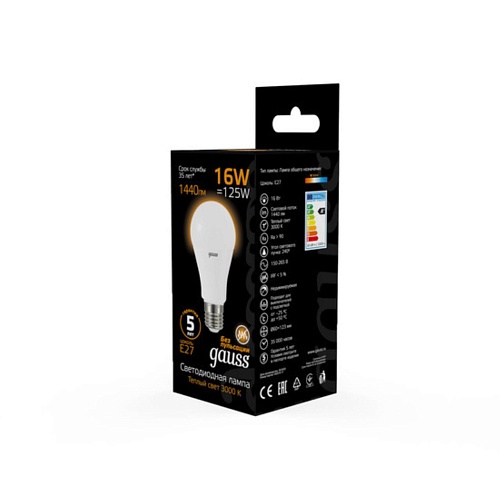 Характеристики Светодиодная лампа Gauss A60 16W 1380Lm 3000K E27 102502116