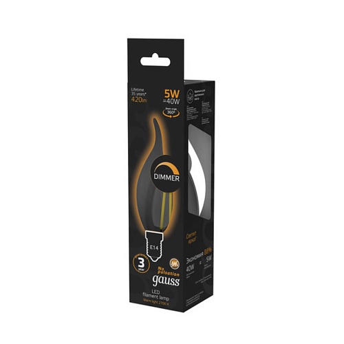 Характеристики Светодиодная филаментная лампа Gauss Свеча на ветру 5W 420Lm 2700K E14 104801105-D