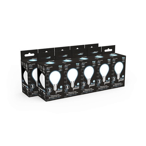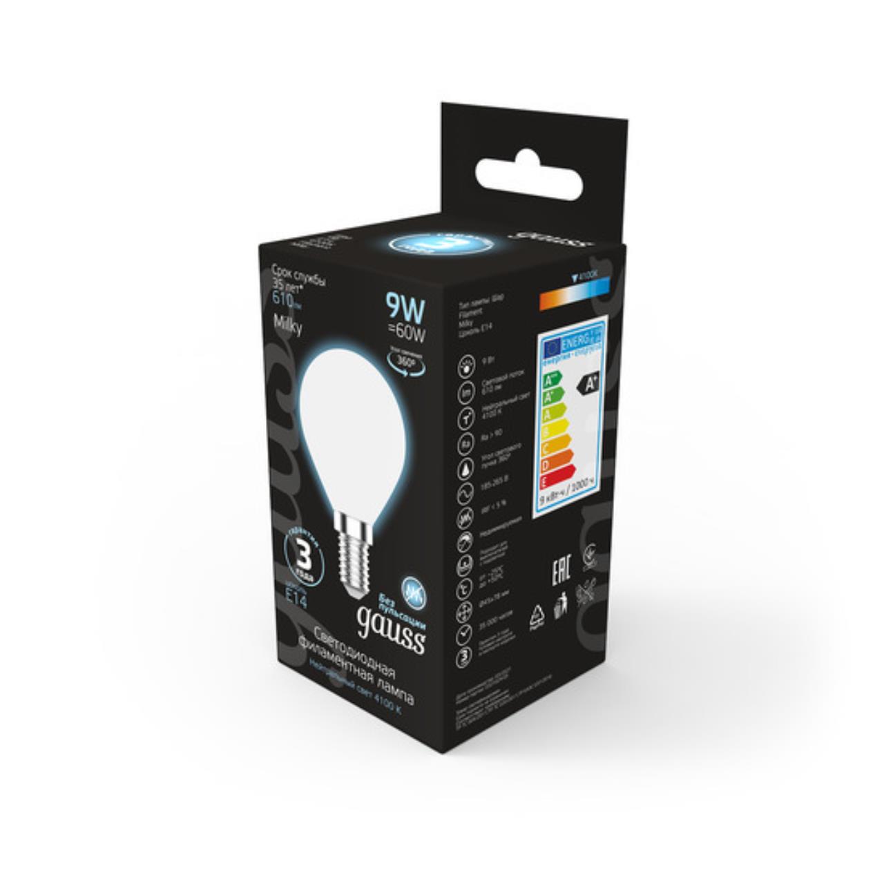 Характеристики Светодиодная филаментная лампа Gauss Шар 9W 610Lm 4100K E14 105201209