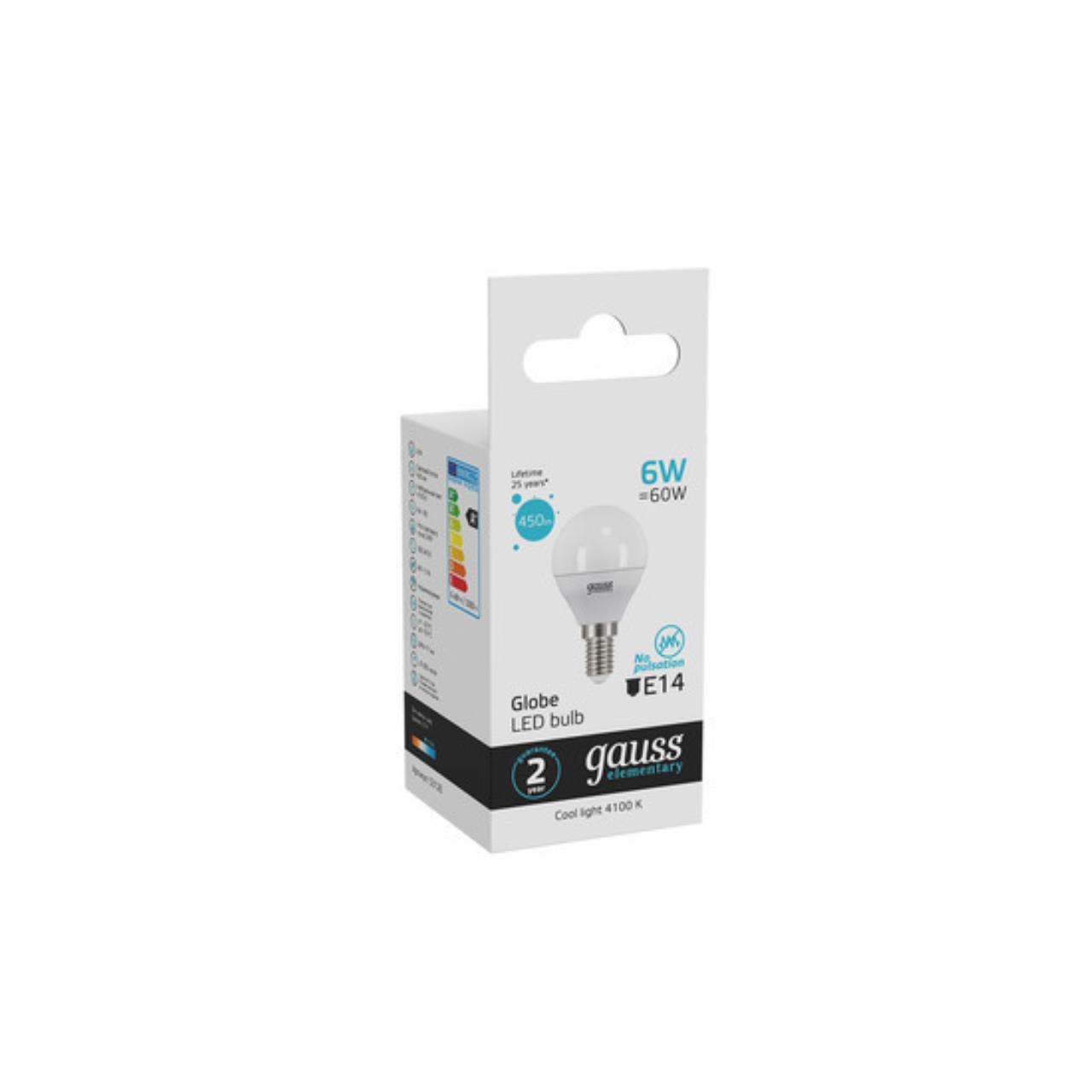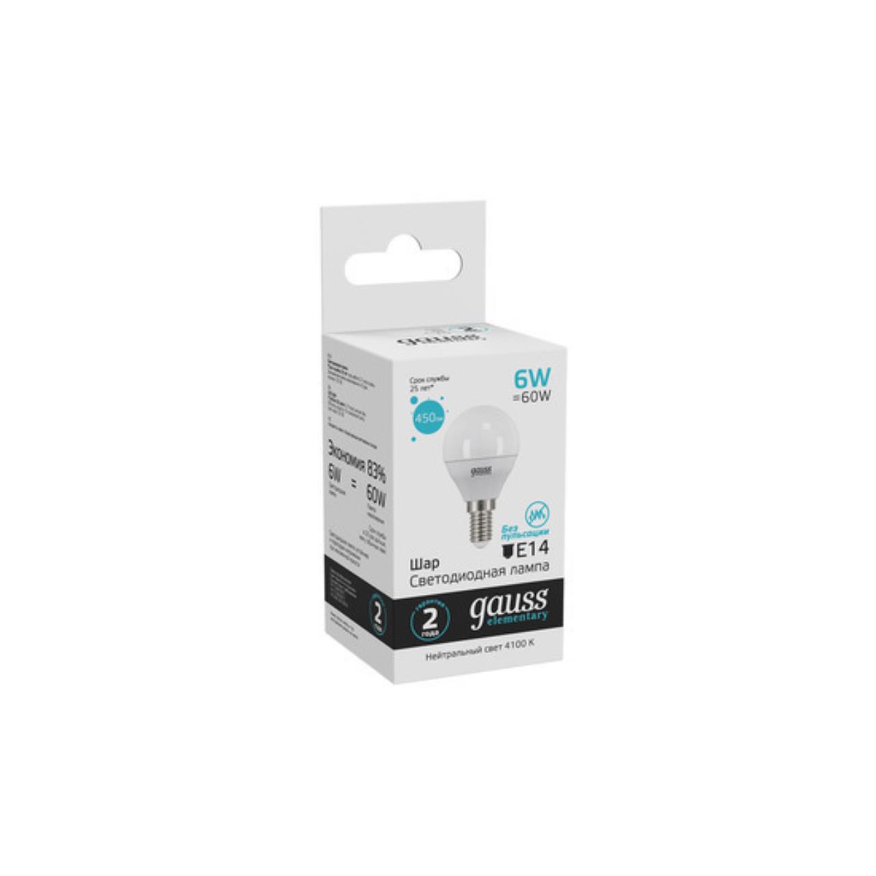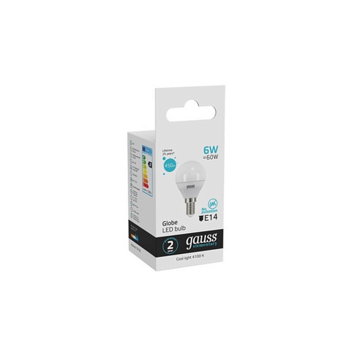 Характеристики Светодиодная лампа Gauss Шар 6W 450Lm 4100K E14 53126