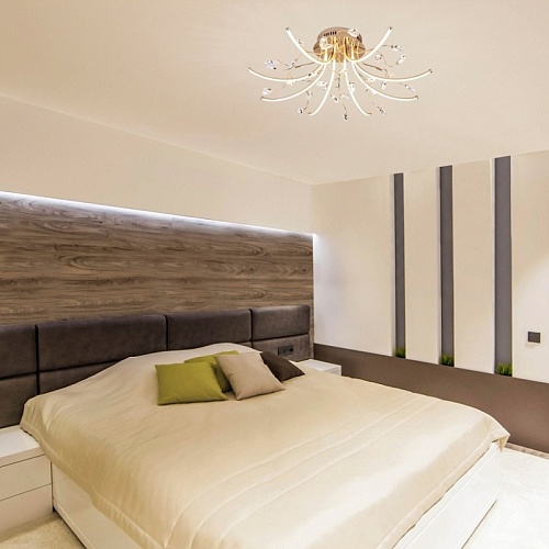 • Важный фактор для потолочных ламп и люстр – направление рассеивания света. Есть различные варианты и направления. В сторону, вверх или вниз, на пол. Если вы выбрали направление «вверх», следует рассмотреть более мощную лампу, так как освещение будет происходить при помощи отраженного от потолка света.