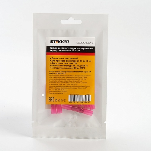 Характеристики Гильза соединительная изолированная термоусаживаемая STEKKER LD300-0515 сечение 0,5-1,5мм2, 19A, розовый (DIY упак 10шт)