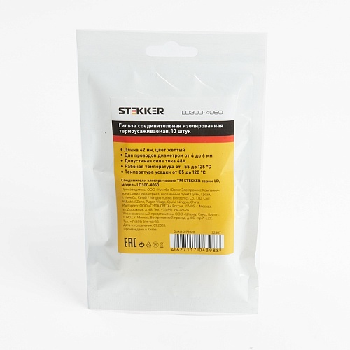 Характеристики Гильза соединительная изолированная термоусаживаемая STEKKER LD300-4060 сечение4-6-2,5мм2, 48A, желтый (DIY упак 10шт)