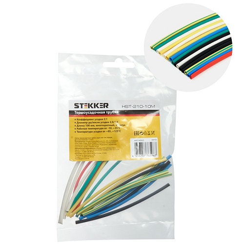 Характеристики Набор термоусадочных трубок STEKKER HSHTS-210-10M, длина 10 см., коэф. усадки 2:1, (21шт в упаковке)
