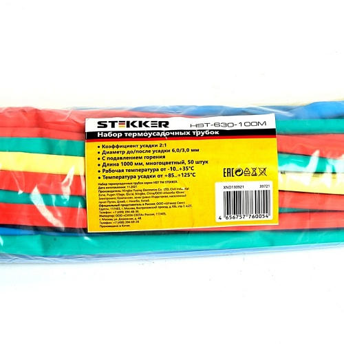 Характеристики Термоусадочная трубка STEKKER HST-630-100M, длина 100 см., коэф. усадки 2:1, мультиколор