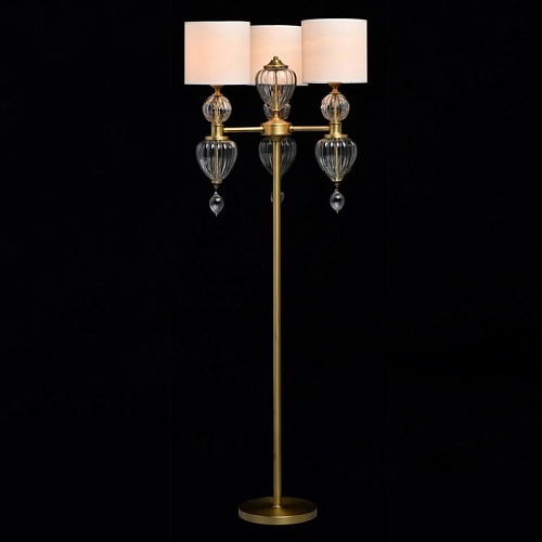 Основание светильника выполнено из металла и гальванизировано в цвет латуни. Светильник декорирован выдувным стеклом ручной работы. Текстильные абажуры белого цвета с термостойким акрилом внутри, отделаны кантом и прошиты.