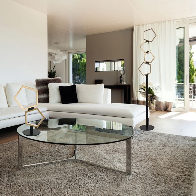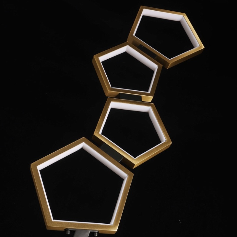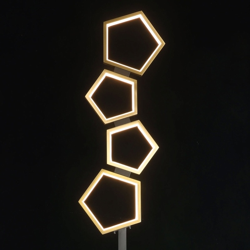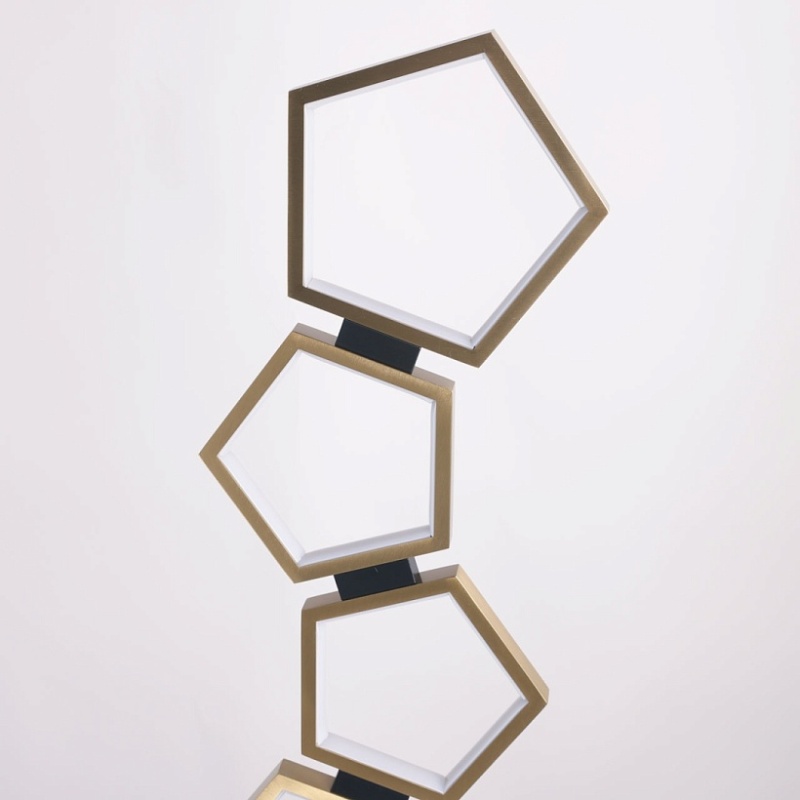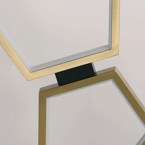 Металлическое основание торшера окрашено в черный цвет. Многогранные плафоны выполнены из сплава алюминия с цинком, обработаны по технологии брашинг и гальванизированы в цвет латуни. Светодиодный источник света закрыт белым матовым акрилом.