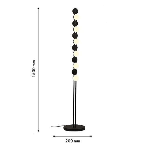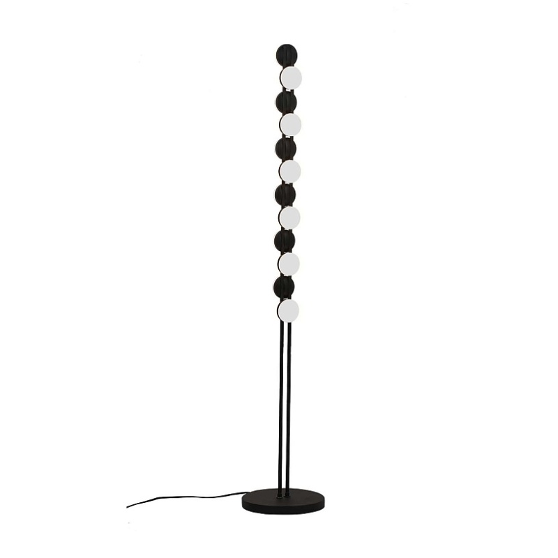 Каркас из металла черного матового цвета, круглые плоские плафоны белого цвета с акриловым рассеивателем, выключатель на проводе, LED-модуль.