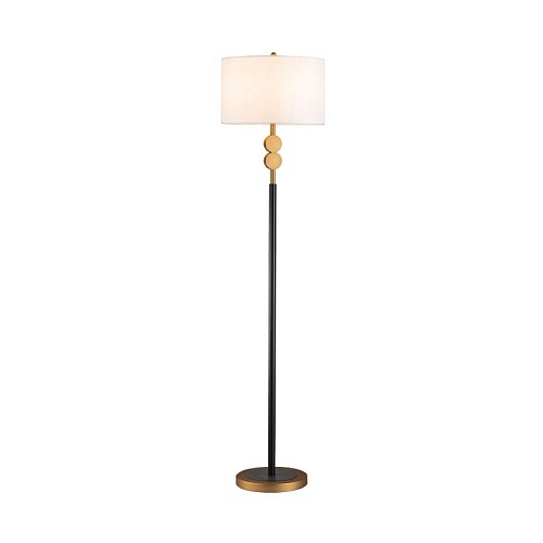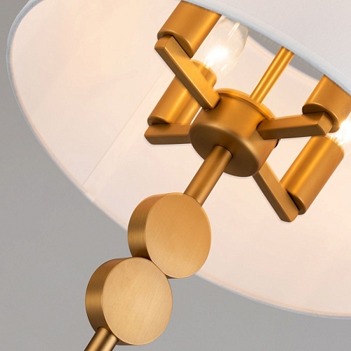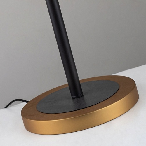 черный каркас с коричневым основанием, плафон из белой ткани, латунный декоративный элемент в виде двух кругов.