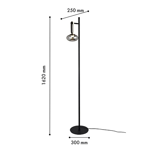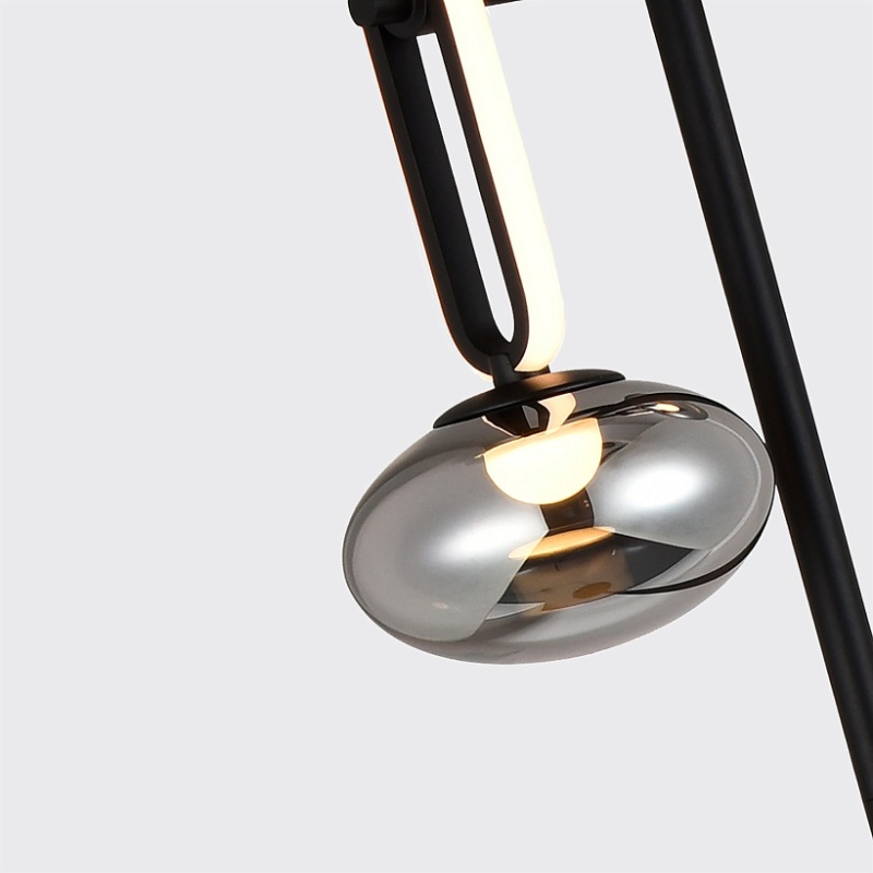 Металлический каркас в черном цвете с выдувным стеклянным плафоном, внутри расположен LED-модуль с закругленным акриловым рассеивателем, декоративный элемент с LED-лентой по внешнему периметру, выключатель на проводе.