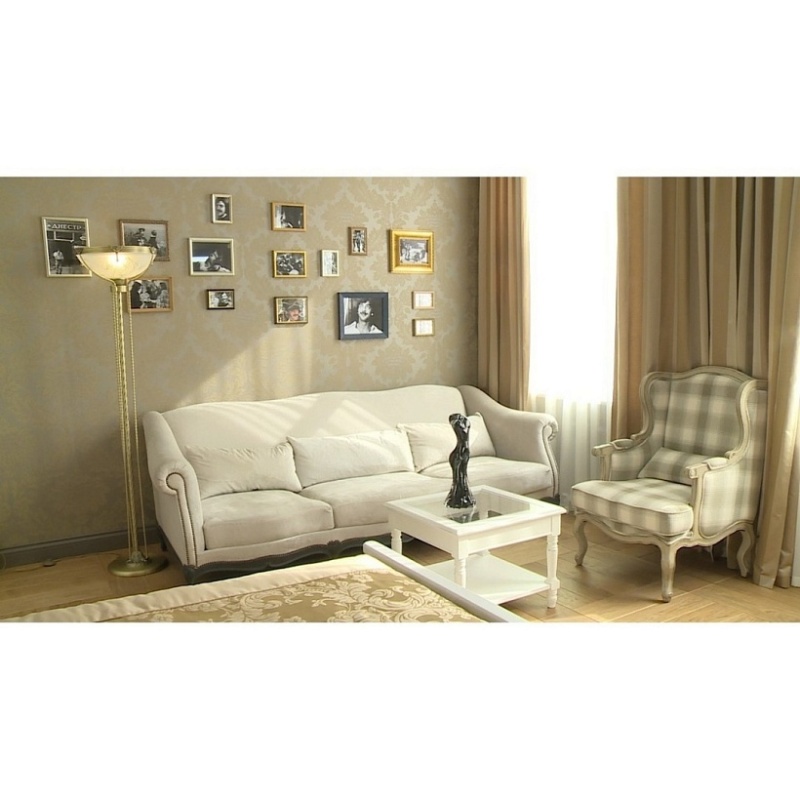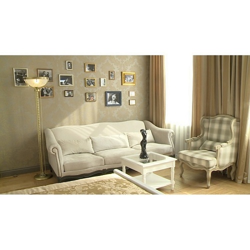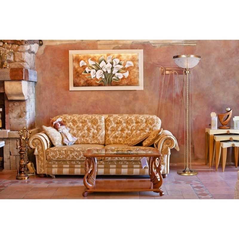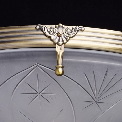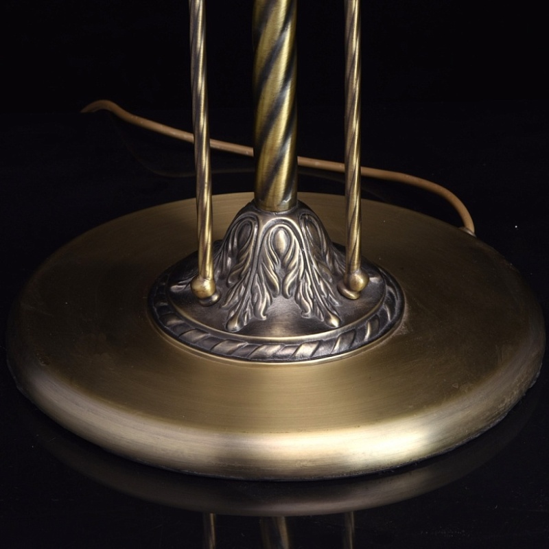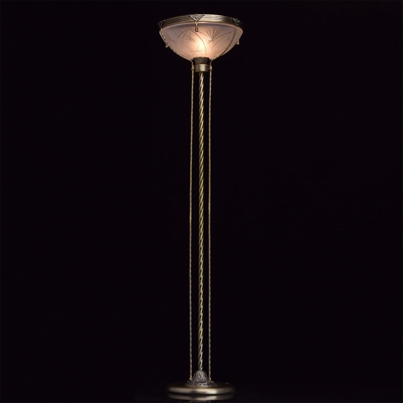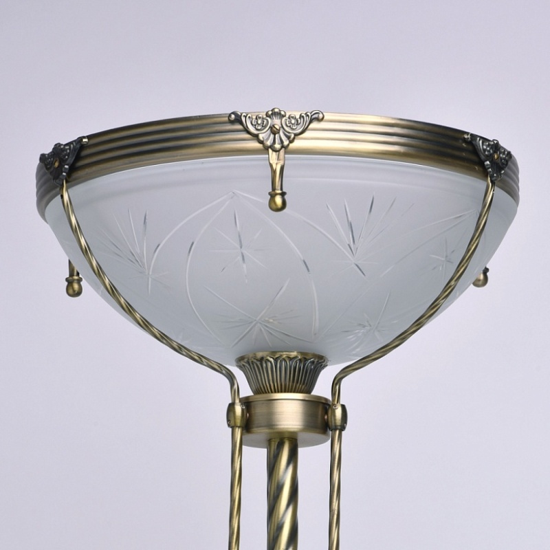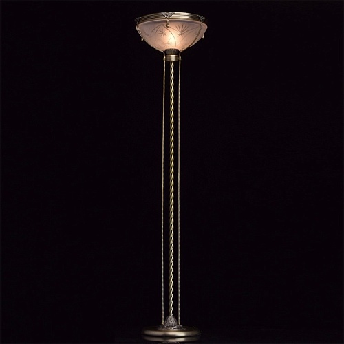 Арматура торшера выполнена из сплава железа и гальванизирована в цвет античной бронзы с эффектом патинирования. Стержень декорирован элементами, выполненными по технологии твист. Плафон изготовлен из прозрачного стекла , обработанного пескоструйным матированием с рисунком нанесенным по технологии алмазной резьбы. Центральный плафон декорирован художественным литьем из сплава алюминия.
