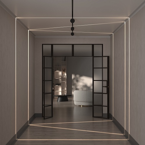 Алюминиевый корпус черного цвета. LED-источник света. Цветовая температура 3000K, 4000К. Модели с регулировкой цветовой температуры от 3000K до 6000K и диммированием по протоколу Bluetooth Mesh. Эффект линии света – «светового коридора». Специальная линза - оптический эффект кругового периферического освещения. Поворотный механизм - вращение по своей оси. Рекомендованная высота потолка в помещении для качественного и красивого луча - 2,2 - 2,5 метра.