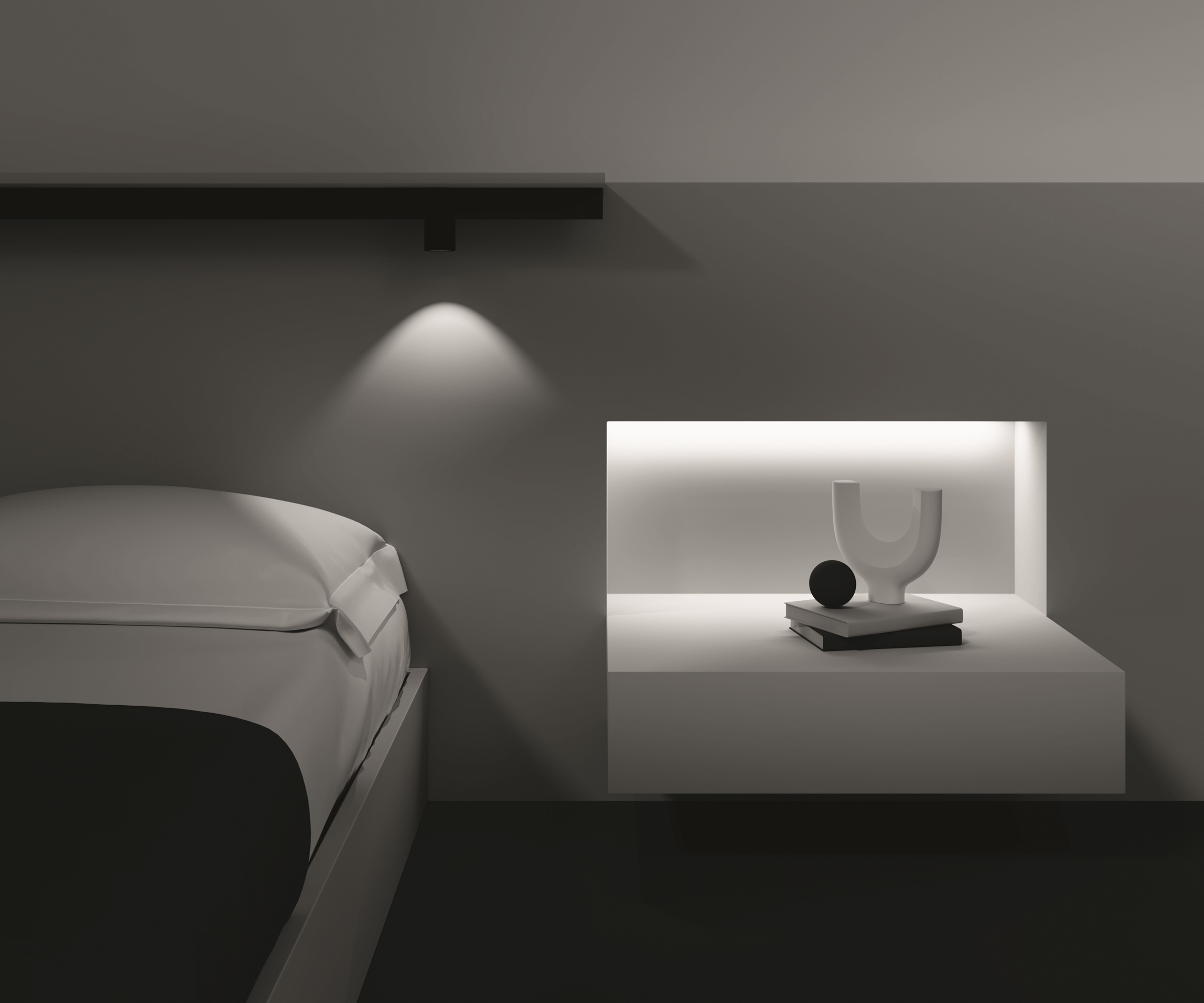 Алюминиевый корпус. Цвета - белый, черный и латунь с черным коннектором для установки в магнитный шинопровод Exility. LED-источник света. Два варианта цветовой температуры - 3000К и 4000К, а также умные светильники с регулировкой цветовой температуры от 3000 K до 6000 K и диммированием по протоколу Bluetooth Mesh. Источник света утоплен вглубь плафона для комфорта зрения. Корпус модели — форма вытянутого куба и цилиндра.