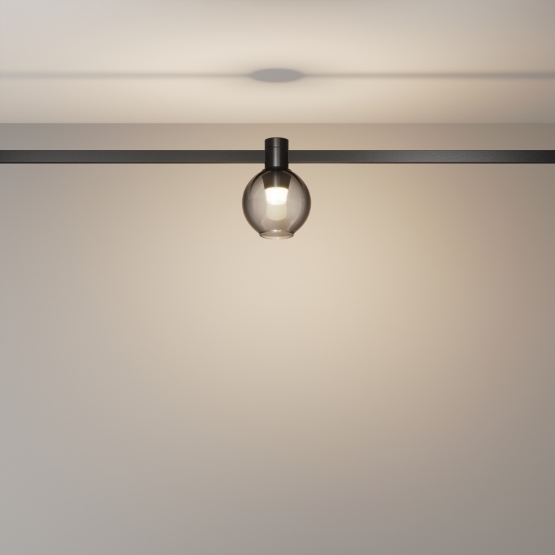 Арматура из алюминия в двух цветах: черном и латунь. Шарообразный дизайнерский плафон из стекла в темном цвете для черной арматуры и в прозрачном для латуни. Долговечные светодиодные лампы бренда Osram с комфортной цветовой температурой 3000К, углом рассеивания 120°, коэффициентом цветопередачи >90. Светильники крепятся к шинопроводу на неодимовые магниты, легко передвигаясь по шине в заданном направлении. Это позволяет создавать интересные световые композиции. Поддерживается функция диммирования в группе (обязательное условие - применение блоков питания DALI / 0~10V).