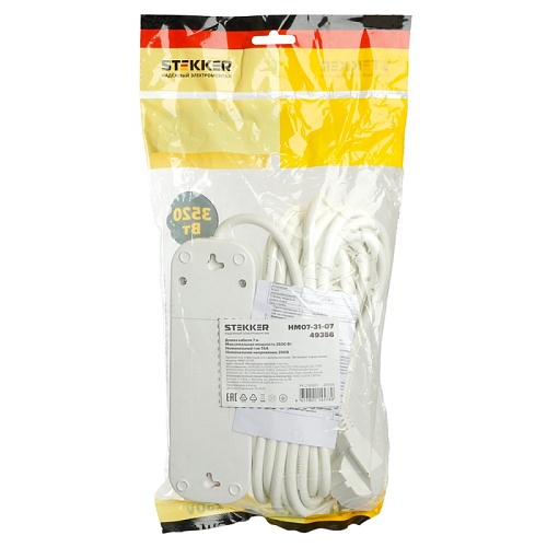 Удлинитель трехместный с/з с выключ. STEKKER HM07-31-07 3x1мм2, 7м, серия Home (У16А-002), белый 49356