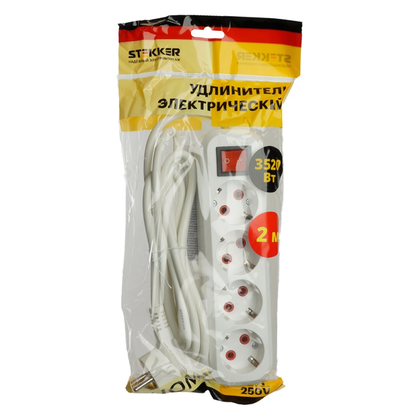 Отзывы о Удлинитель четырехместный с/з с выключ. STEKKER HM07-41-02 3x1мм2, 2м, серия Home (У16А-003), белый