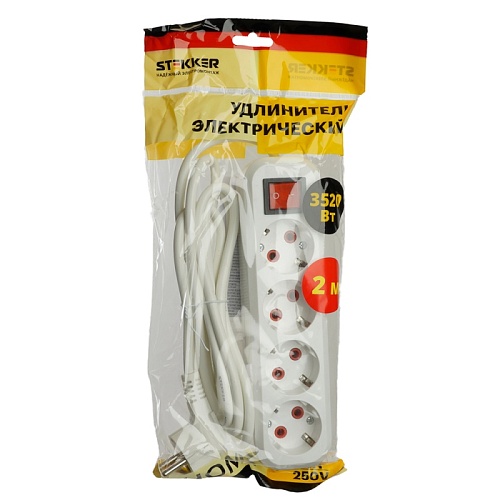 Характеристики Удлинитель четырехместный с/з с выключ. STEKKER HM07-41-02 3x1мм2, 2м, серия Home (У16А-003), белый