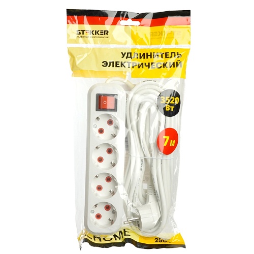 Удлинитель четырехместный с/з с выключ. STEKKER HM07-41-07 3x1мм2, 7м, серия Home (У16А-003), белый 49361