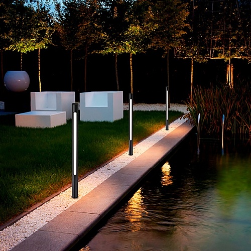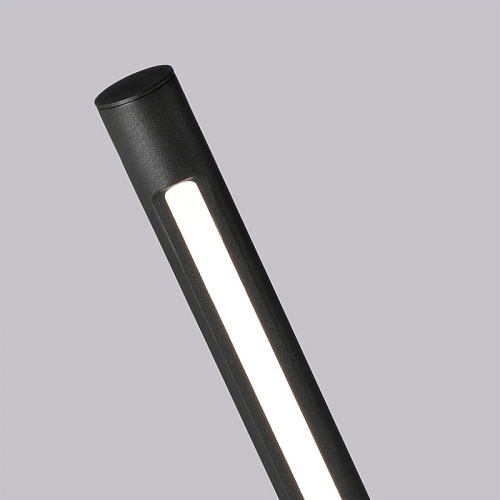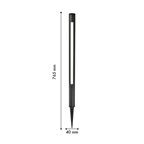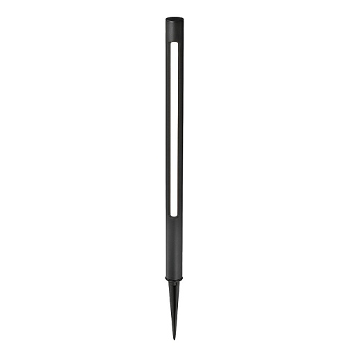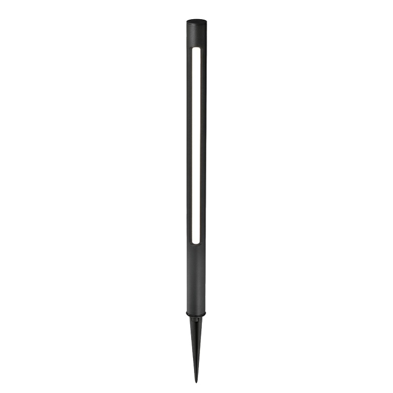 Уличный ландшафтный столбик в черном цвете, с колышком на конце, источник света вытянут вдоль одной стороны каркаса, IP65.