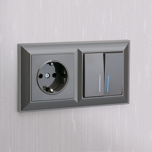 Характеристики Выключатель двухклавишный проходной с подсветкой серо-коричневый WL07-SW-2G-2W-LED