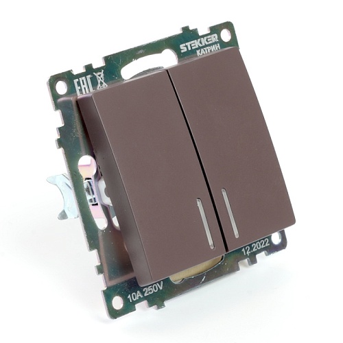 Характеристики Выключатель 2-клавишный c индикатором (механизм), STEKKER GLS10-7102-04, 250В, 10А, серия Катрин, шоколад