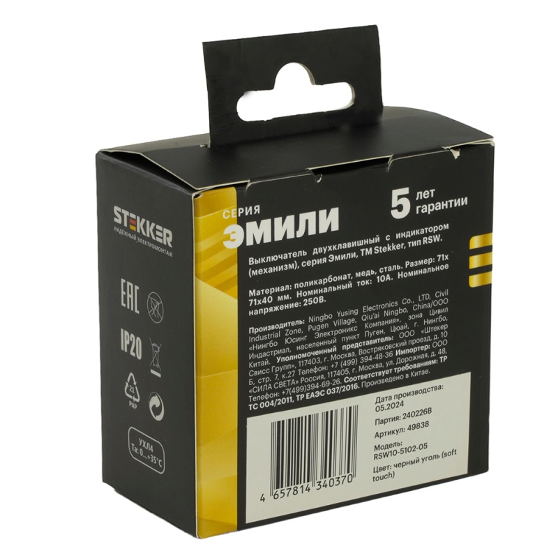 Отзывы о Выключатель 2-клавишный c индикатором (механизм), STEKKER, 250В, 10А, серия Эмили, RSW10-5102-05, черный уголь, soft touch