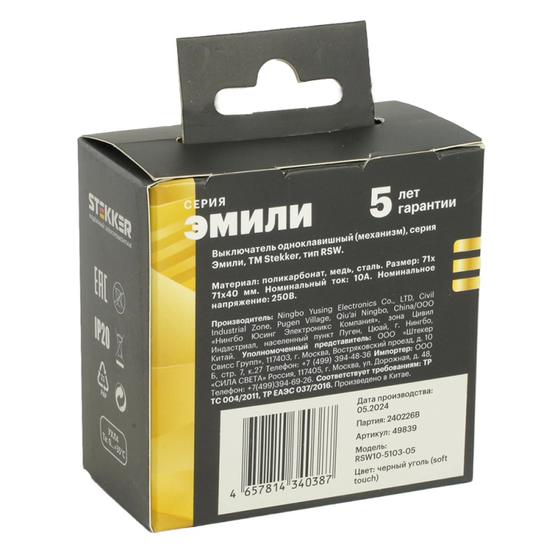 Отзывы о Выключатель 1-клавишный (механизм), STEKKER, 250В, 10А, серия Эмили, RSW10-5103-05, черный уголь, soft touch