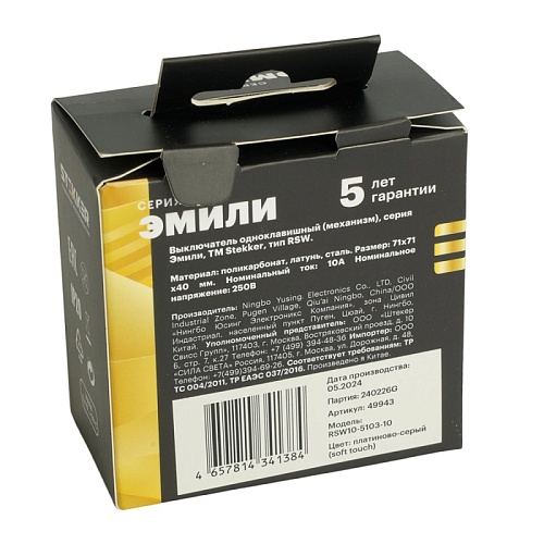 Отзывы о Выключатель 1-клавишный (механизм), STEKKER, 250В, 10А, серия Эмили, RSW10-5103-10, платиново-серый, soft touch