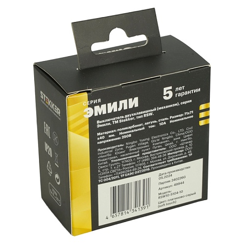 Отзывы о Выключатель 2-клавишный (механизм), STEKKER, 250В, 10А, серия Эмили, RSW10-5104-10, платиново-серый, soft touch