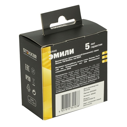 Характеристики Выключатель 3-клавишный (механизм), STEKKER, 250В, 10А, серия Эмили, RSW10-5108-10, платиново-серый, soft touch