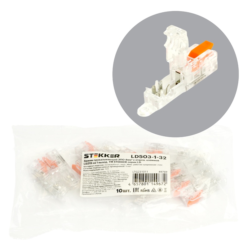 Характеристики Зажим прокалывающий ответвительный 4 мм2 c ответвительной клеммой LD219 на 1 выход, прозрачный/красный (упаковка 10 шт) LD503-1-32