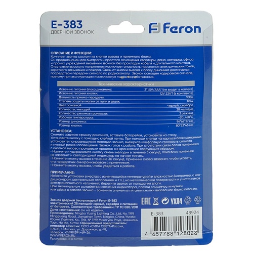 Отзывы о Звонок дверной беспроводной Feron E-383 Электрический 38 мелодий черный, серебро с питанием от батареек